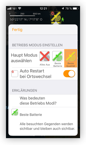 Aber durch “Auto Restart”, wird GPS nur aktiviert, wenn es sinnvoll und notwendig ist.