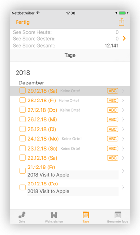 Wahrzeichen: Hierarchische Liste aller besuchten Wahrzeichen. Auch hier können die einzelnen Ebenen gefaltet werden
